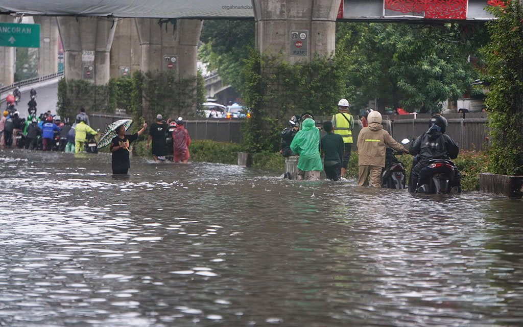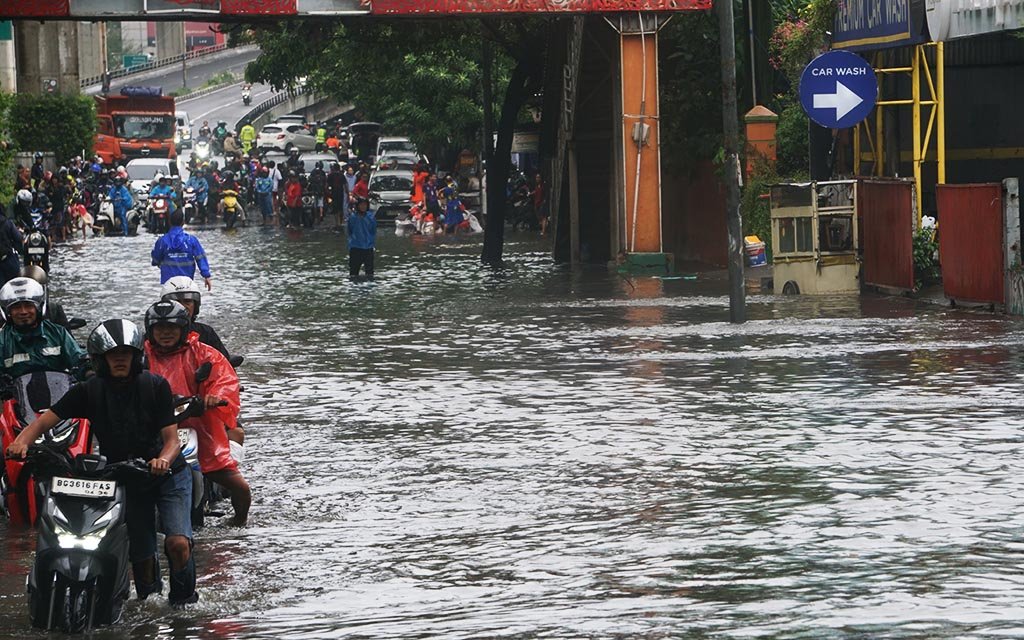 Pengendara menuntun motor melintasi banjir di Jl Kapten Tendean, Jakarta, Minggu (8/3/2026). JaringBisnis/Yayus Yuswoprihanto