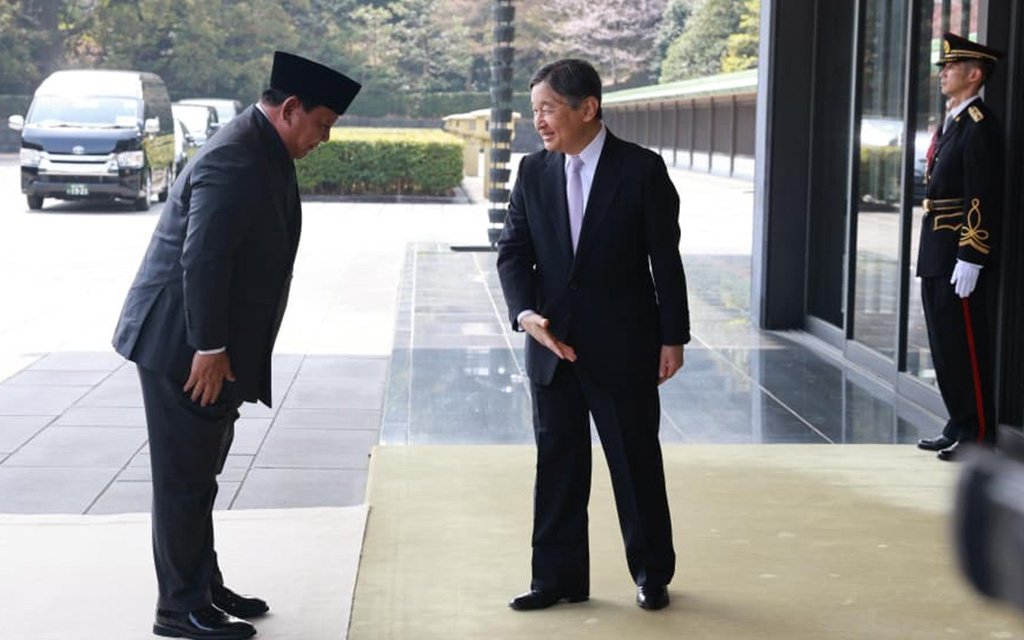 Kaisar Jepang Naruhito (kanan) menyambut kedatangan Presiden Prabowo Subianto di Istana Kekaisaran Jepang. BPMI Setpres/Laily Rachev