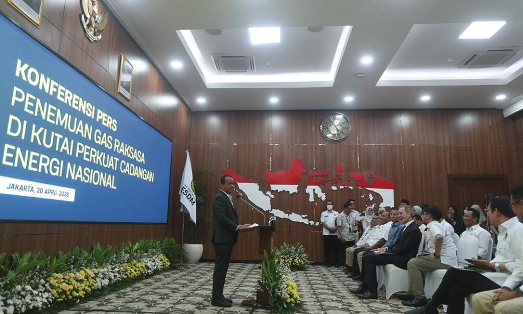 Jakarta, JaringBisnis. Menteri Energi dan Sumber Daya Mineral Bahlil Lahadalia mengumumkan temuan gas bumi di Sumur Geliga-1 Blok Ganal, lepas pantai Kalimantan Timur, dengan potensi sekitar 5 triliun kaki kubik (Tcf) serta 300 juta barel kondensat, saat konferensi pers Penemuan Gas Raksasa di Kalimantan Timur yang digelar di Kantor Kementerian ESDM Jakarta, Senin (20/4/2026). Temuan ini berada di Wilayah Kerja (WK) Ganal yang dioperasikan ENI dengan porsi kepemilikan 82 persen, sementara 18 persen sisanya dimiliki Sinopec.