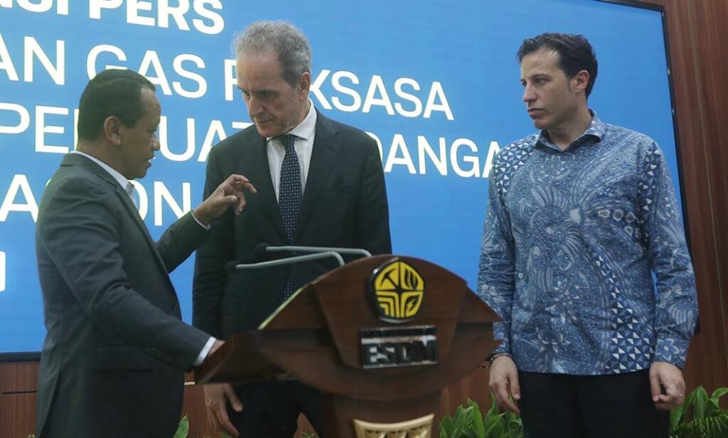 Menteri Energi dan Sumber Daya Mineral Bahlil Lahadalia (kiri) berbincang dengan Head of Middle and Far East Region ENI Ciro Pagano (tengah). JaringBisnis/Yayus Yuswoprihanto