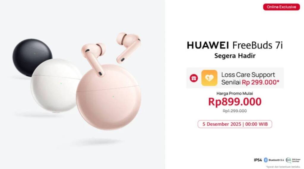 HUAWEI FreeBuds 7i kinbni tersedia secara eksklusif di HUAWEI Online Store serta sejumlah platform e-commerce seperti Shopee, TikTok Shop, Tokopedia, Blibli, dan Lazada mulai 5 Desember 2025. Setiap pembelian unit juga disertai HUAWEI Loss Care Support senilai Rp299.000, yang memberi perlindungan tambahan bagi pengguna. (JB/03/Wid)