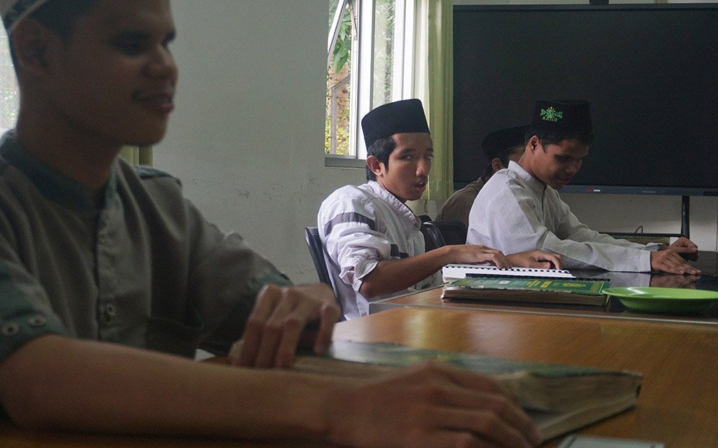 Jakarta, JaringBisnis. Alunan ayat-ayat suci Alquran sayup-sayup terdengar merdu saat memasuki halaman Pondok Pesantren Raudlatul Makfufin, Kota Tangerang Selatan, Banten. Sejumlah santri penyandang tuna netra terlihat duduk berkelompok di bawah pohon sambil membaca dan menghafal Alquran.