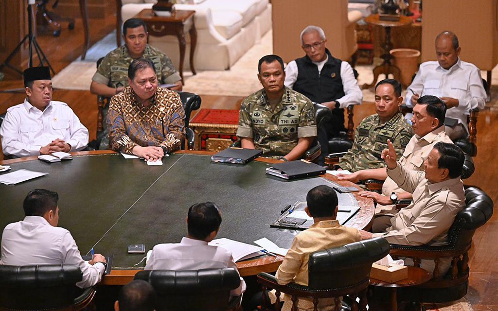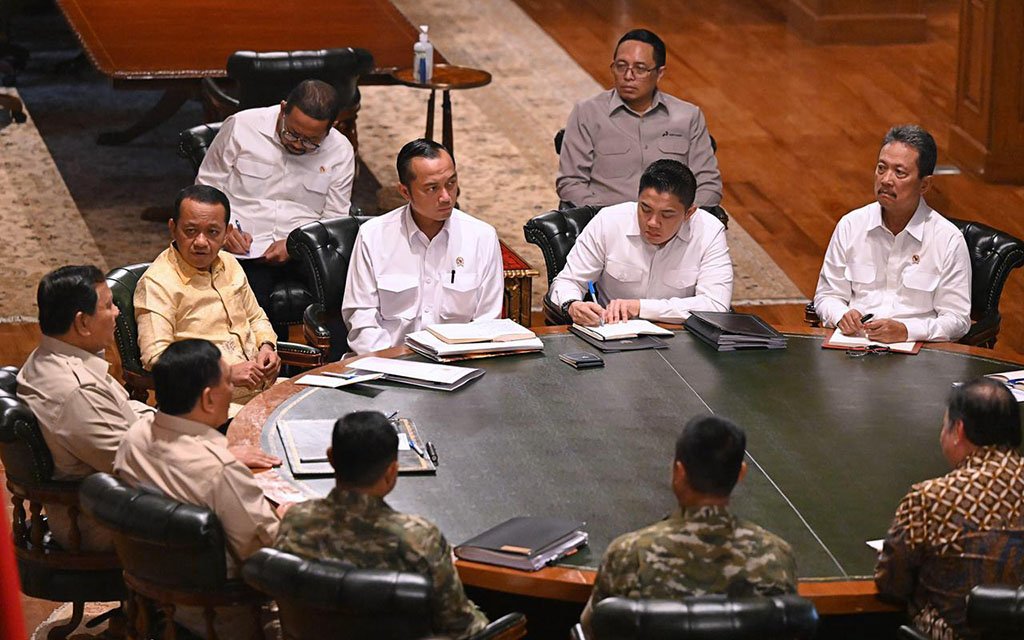 Presiden Prabowo Subianto (dari kiri) memberikan arahan disaksikan Menteri Energi dan Sumber Daya Mineral Bahlil Lahadalia (dari kiri), Menteri Sekretaris Negara Prasetyo Hadi, Sekretaris Kabinet Teddy Indra Wijaya, dan Menteri Kelautan dan Perikanan Sakti Wahyu Trenggono. Setkab/Muchlis Jr.