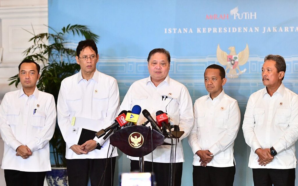 Menko Perekonomian Airlangga Hartarto (tengah), Menkeu Purbaya Yudhi Sadewa (kedua kiri), Menteri ESDM Bahlil Lahadalia (kedua kanan), Menteri Kelautan dan Perikanan Sakti Wahyu Trenggono (kanan), dan Mensesneg Prasetyo Hadi memberikan keterangan pers. BPMI/Setpres