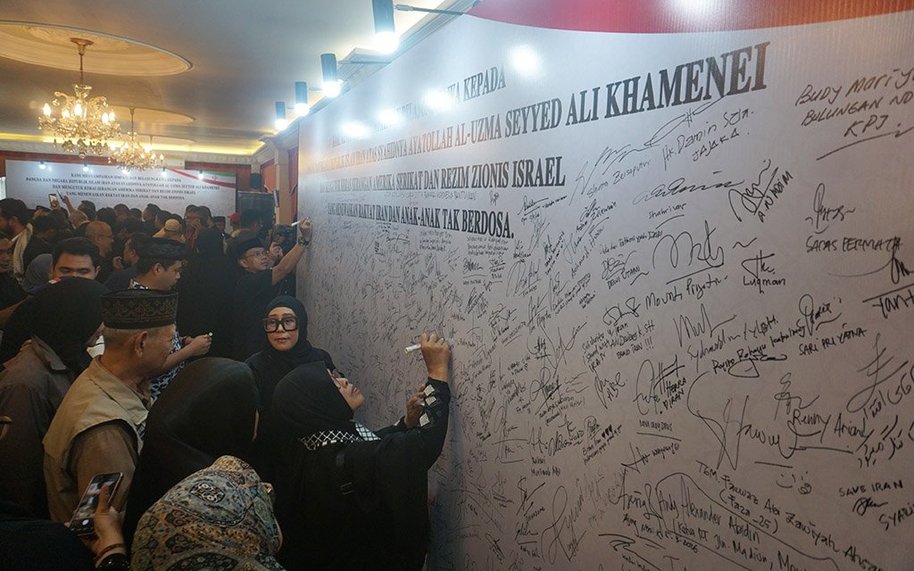Warga yang mayoritas mengenakan busana warna hitam terlihat berdoa di depan foto mendiang Ayatollah Seyyed Ali Khamenei. Sementara itu di ruang lainnya tampak masyarakat membubuhkan tanda tangan ucapan duka cita sekaligus wujud solidaritas dan dukungan moral terhadap perdamaian serta penegakan hukum internasional. Duta Besar Iran untuk Indonesia Mohammad Boroujerdi menegaskan bahwa Iran mengutuk keras serangan Amerika Serikat dan Israel yang telah menewaskan rakyat dan ratusan anak-anak.
