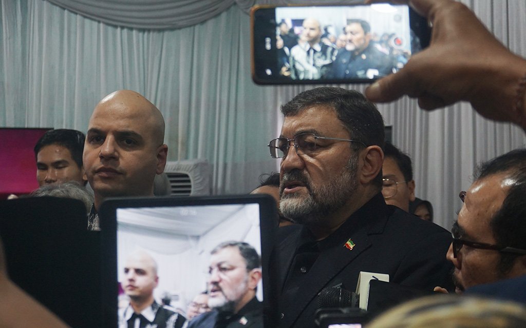 Duta Besar Iran untuk Indonesia Mohammad Boroujerdi memberikan keterangan pers seusai doa bersama.
