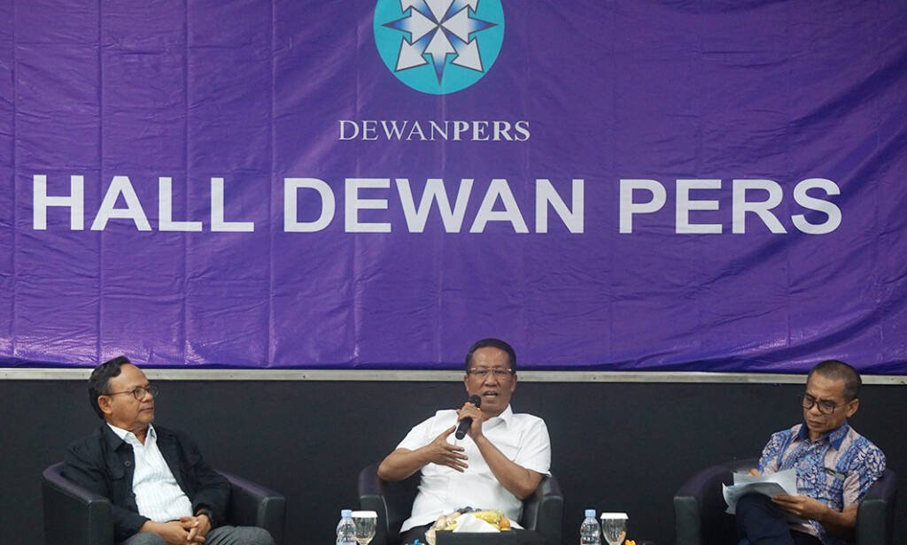 Menteri Hukum Supratman Andi Agtas (tengah) menyampaikan penjelasan dihadapan peserta diskusi didampingi Ketua Dewan Pers Komaruddin Hidayat (kiri) dan moderator Dahlan Dahi. JaringBisnis/Yayus Yuswoprihanto